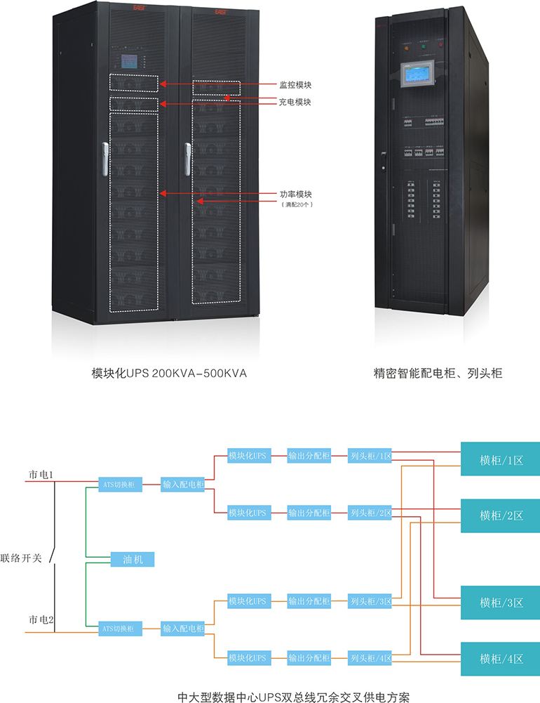 电源分配列柜简称列头柜,分普通列头柜和精密智能配电柜本设备主要用于通信机房及站传输设备机房,安装在设备的列头和列尾,与条形架通信机 列、光端机列等配套,通过本设备中的配电装置,为通信设备进行电源分配。精密列头柜是机房配电在整个机房中起到至关重要的一环,但是也是很容易被忽视的一关,现在的机房设备服务器、空调、UPS、风机等都已经做到了随时可以监控的这一步,而机房配电的监控恰恰是一个空白,传统的配电柜也只是几个表头加上几路所需的开关而已,即使做动环监控也只是在配电柜里进行二次改造(增加各种模块)。这样既繁琐而且效果也不大。机房配电回路一般是双路市电接入,首先进市电配电箱,一部分给UPS,一部分给空调和照明、普通插座,UPS下端再进UPS配电柜,分配到各个列头柜,经列头柜后接入各机柜PDU再到负载。列头柜电源进线一般选用双电源进线,当一路电源系统故障断电时,另一路电源自动投入以保证供电连续性。为实现短路、过载保护,在双电源前使用塑壳断路器,提供短路、过载保护,还具备隔离功能,方便检修。箱内一般需设置电气火灾监控系统,电气火灾探测器和监控单元。由于机房设备对雷击非常敏感,所以一般要选配浪涌保护器。列头柜的主要出线回路可以选择塑壳断路器,如果有需要,可以加装漏电模块。机房设备的供电连续性非常重要,列头柜进线处配置有电力参数测量仪,能实时监视电气参数水平,及时发送故障报警信号,提前发现潜在的故障隐患,同时监视用电能耗水平。列头柜柜内可按需选配配电模块,模块化结构便于拆装、维护,模块允许用户快速、灵活的增加和删减回路,满足机房用电量的扩容需求。